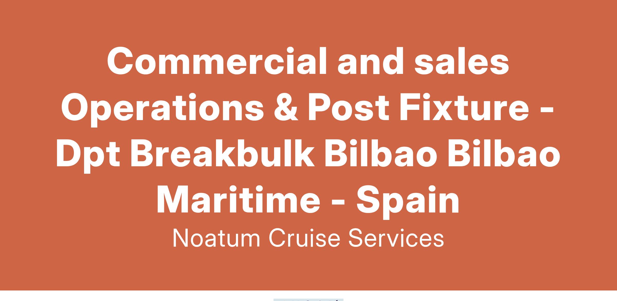 Actualmente estamos buscando incorporar un perfil de Operations & Post Fixture para incorporarse en nuestro equipo Comercial, dpto Breakbulk en Noatum Chartering que se encarga de fletamentos y operaciones portuarias en nuestras oficinas de Bilbao.