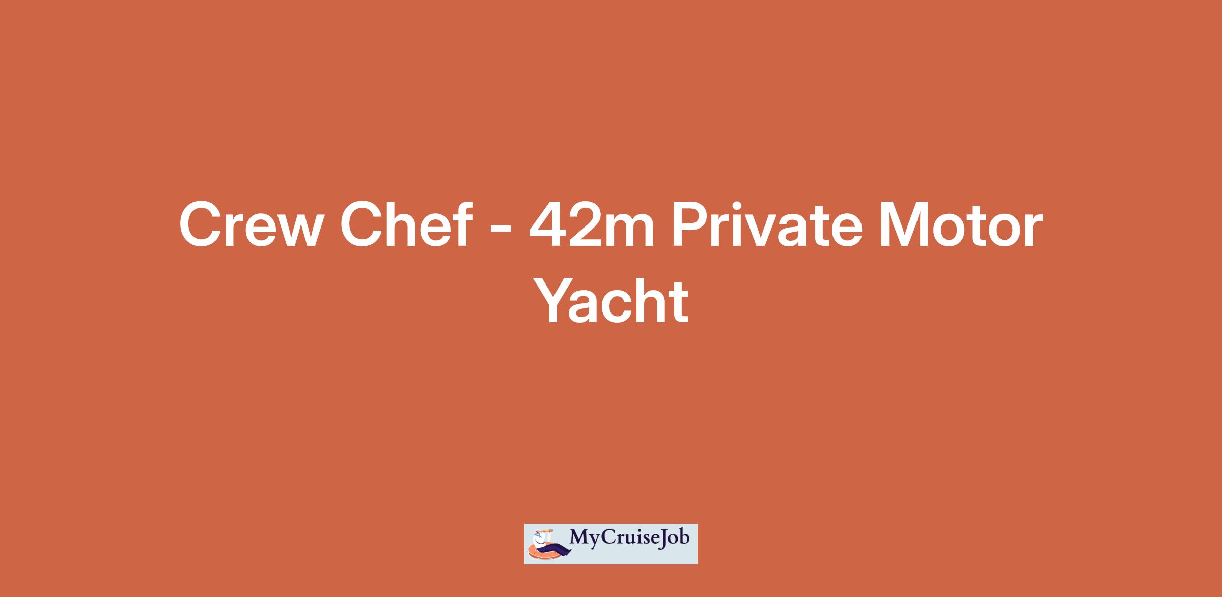 OverviewSeeking a Crew Chef for a 42-metre private motor yacht42m private motor yacht β permanent position starting ASAP. 38 days leave, shared cabin. Lovely American family owners, tight knit crew of 8. Guests on approximately 1 week per month during the season. Winters in Vilanova;