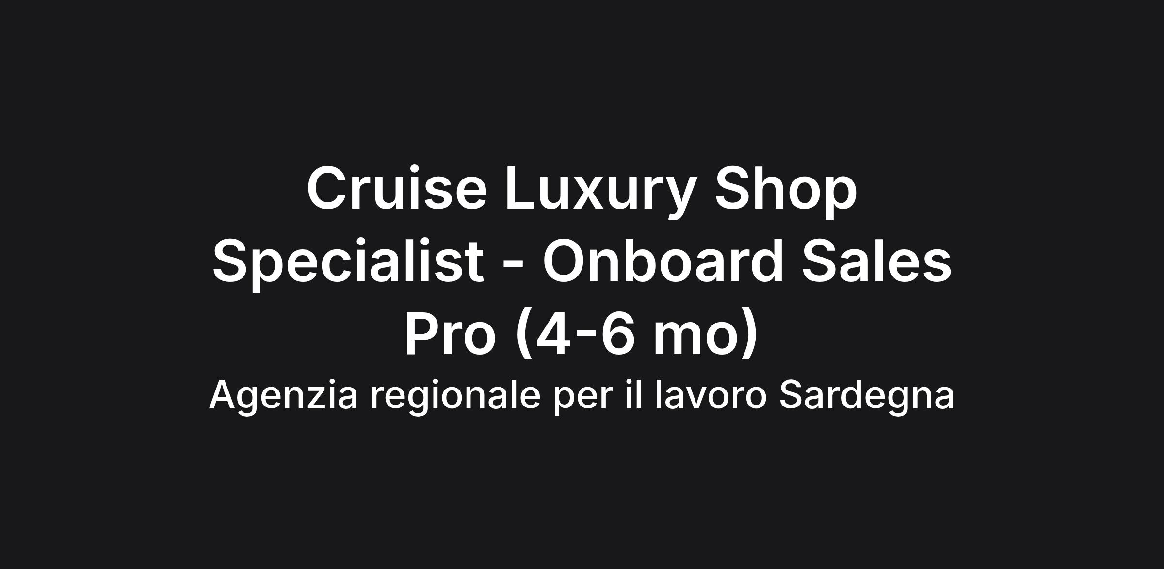 L'Agenzia regionale per il lavoro Sardegna è alla ricerca di 10 Addetti vendita - Costa Shop Specialist per Costa Crociere. Il ruolo richiede esperienza nella vendita al dettaglio e conoscenza delle lingue inglese e di almeno un'altra lingua. I candidati devono essere disponibili per un imbarco di 4-6 mesi continuativi con vitto e alloggio inclusi. Si offre inquadramento CCNL Marittimi navi da crociera.#J-18808-Ljbffr