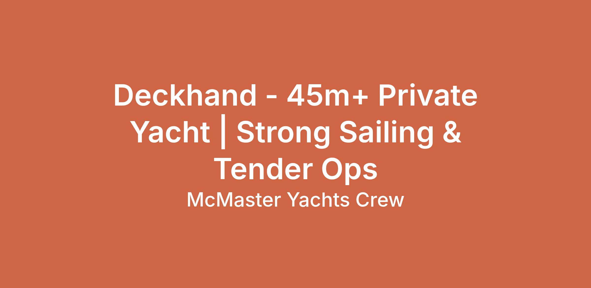 A private yacht company is seeking a Deckhand for a 45m+ S.Y. based in Palma, Spain. The ideal candidate should have strong sailing skills, a Yacht Master Offshore certificate, and be comfortable interacting with guests. The position requires a B1B2 visa and a full driving license. Candidates should be non-smokers and social drinkers, with extra skills in diving or dinghy sailing regarded as beneficial. The salary and leave package are negotiable based on experience.#J-18808-Ljbffr