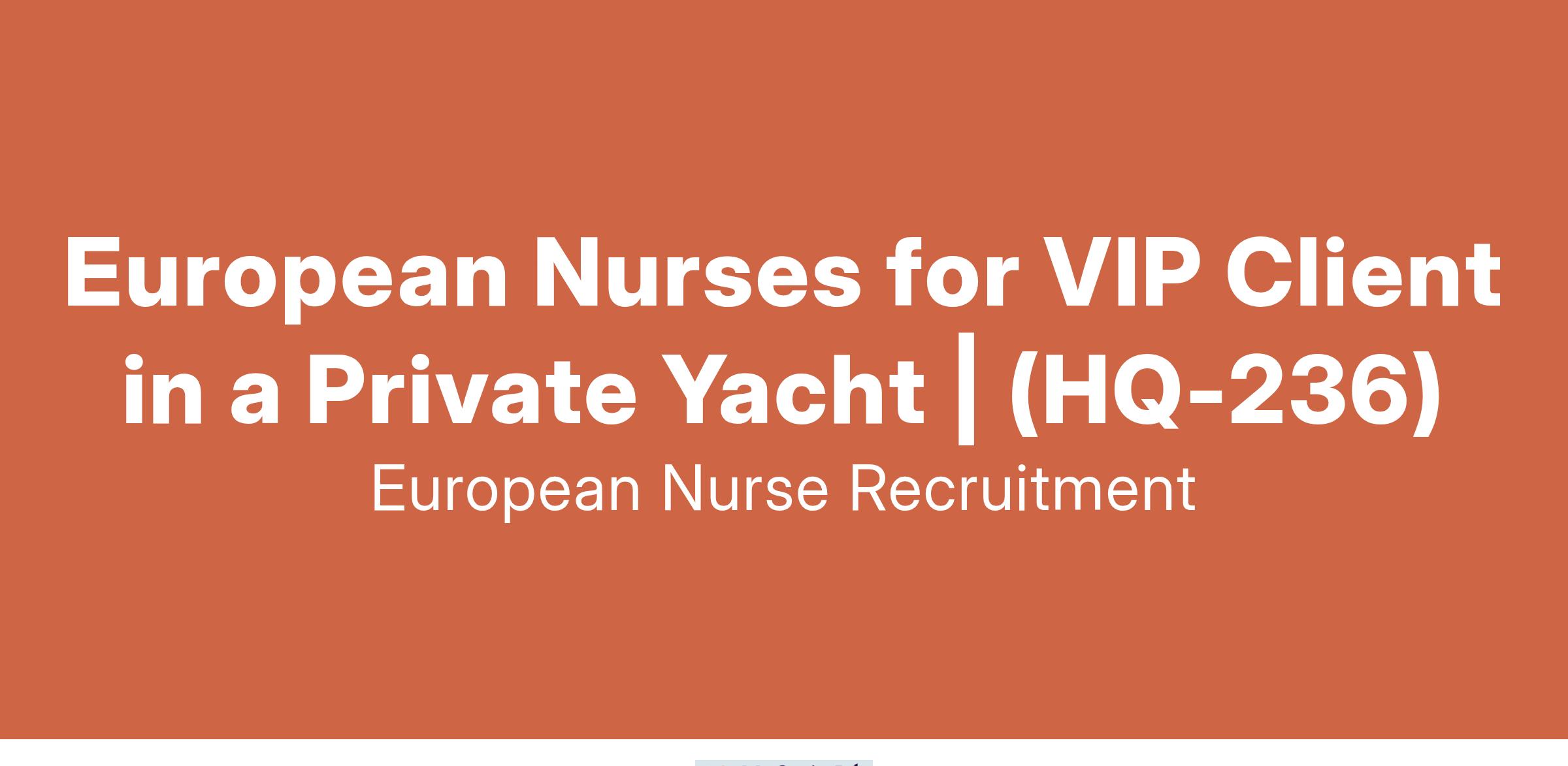We are seeking European Nurses to provide premium healthcare for a VIP client traveling internationally aboard a luxury private yacht.