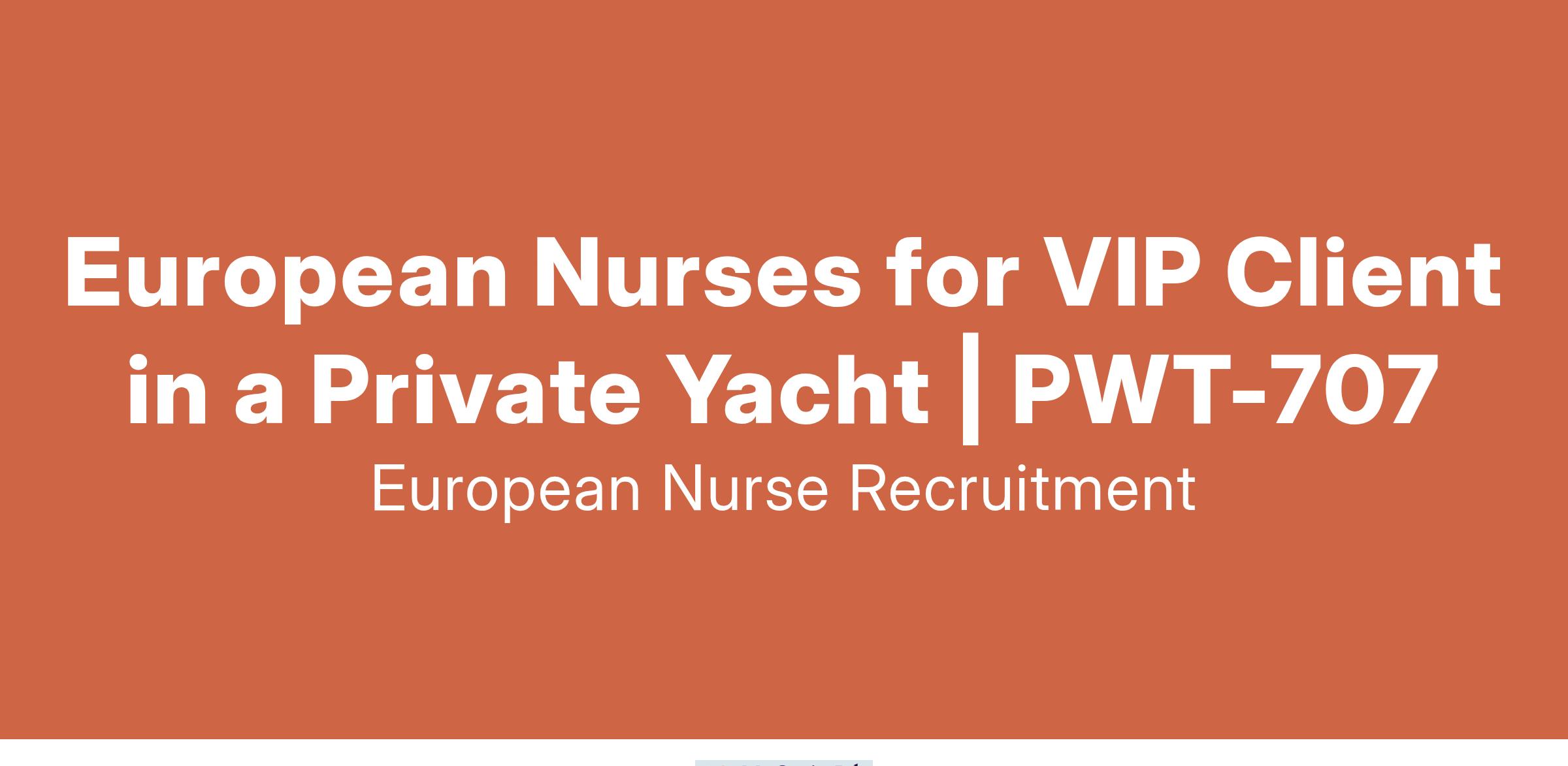 We are seeking European Nurses to provide premium healthcare for a VIP client traveling internationally aboard a luxury private yacht.