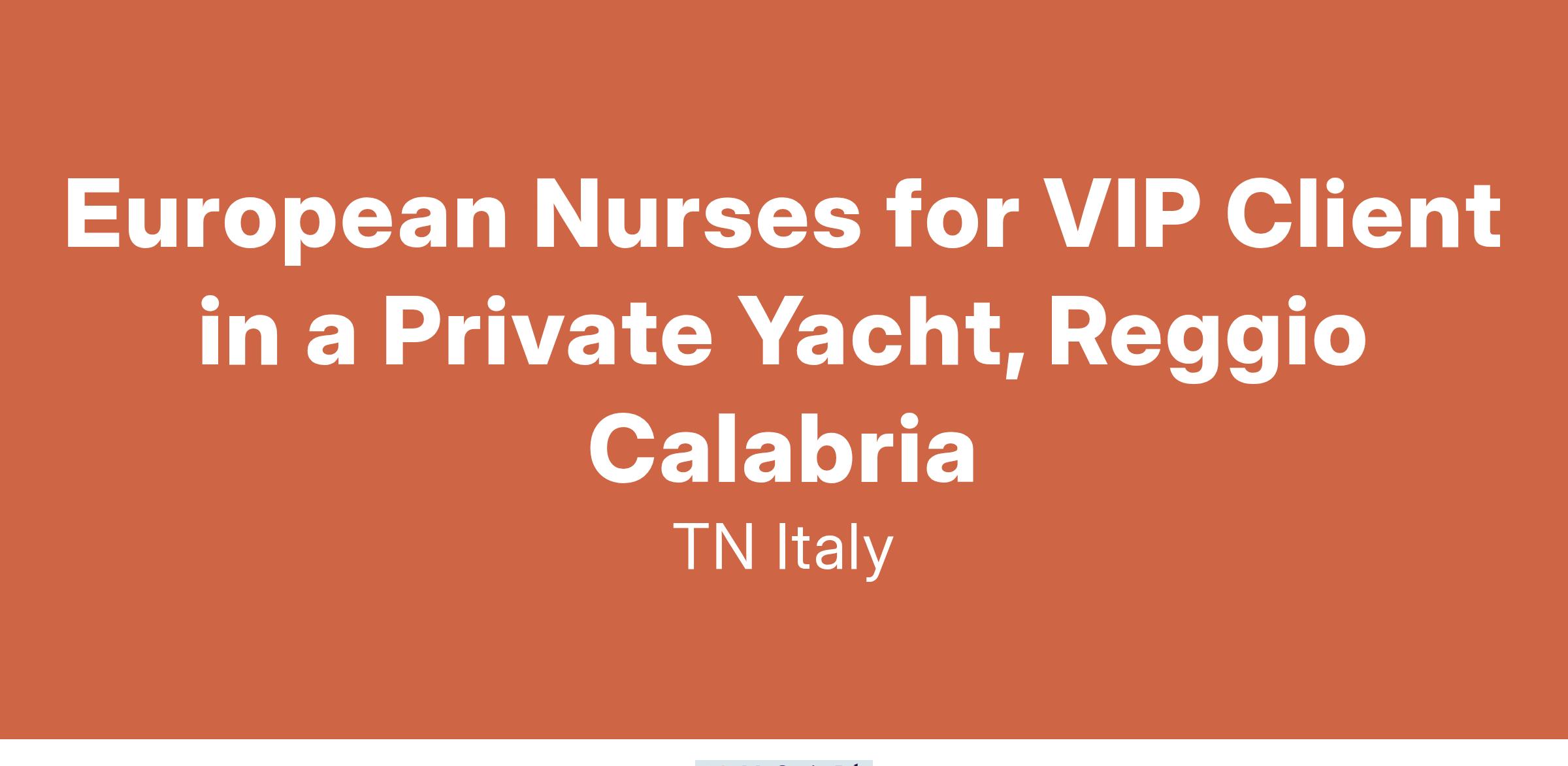 We are seeking European Nurses to provide premium healthcare for a VIP client traveling internationally aboard a luxury private yacht.