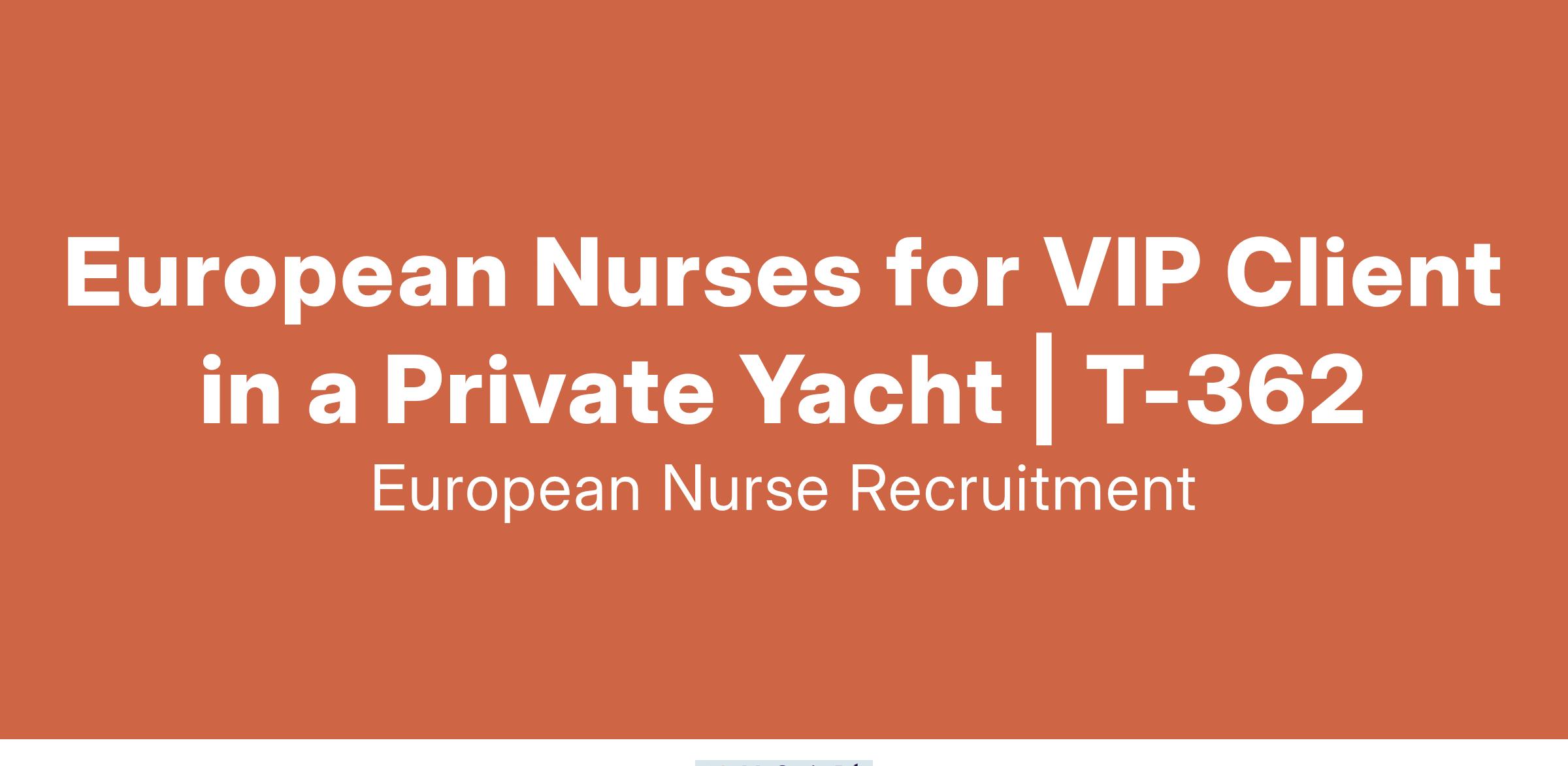 We are seeking European Nurses to provide premium healthcare for a VIP client traveling internationally aboard a luxury private yacht.