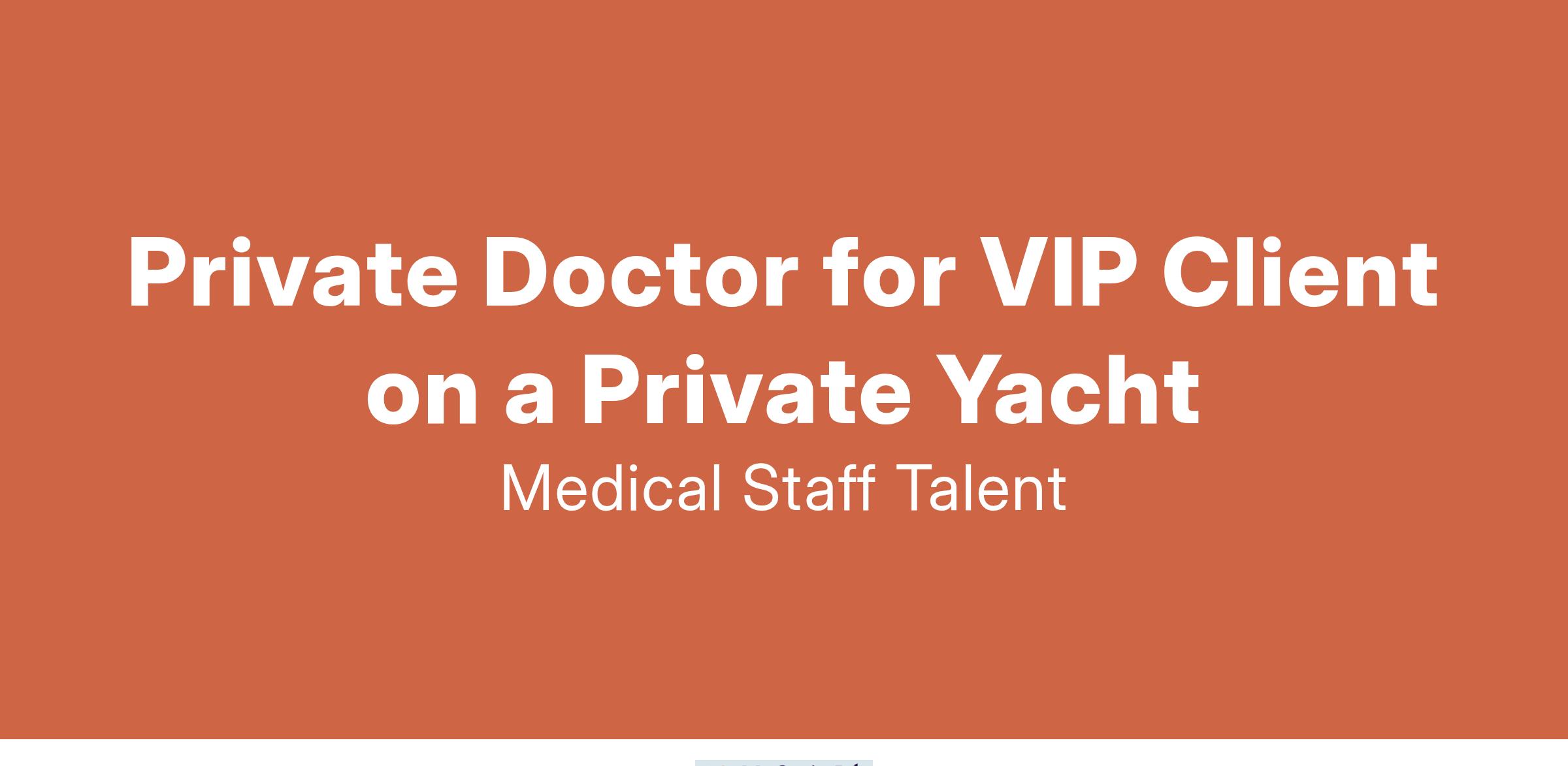 We are seeking a Private Doctor to provide premium 24/7 medical care to a VIP client traveling internationally aboard a luxury private yacht.