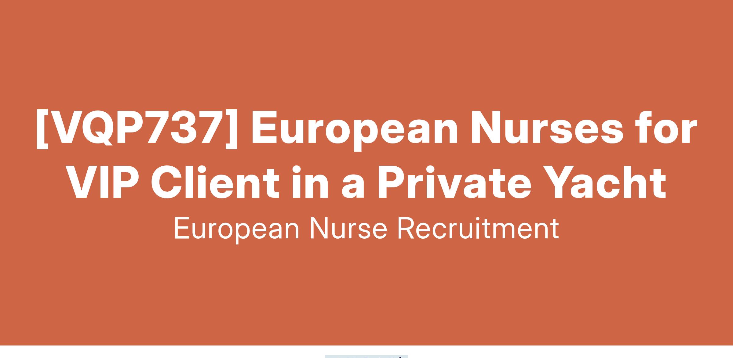 We are seeking European Nurses to provide premium healthcare for a VIP client traveling internationally aboard a luxury private yacht.